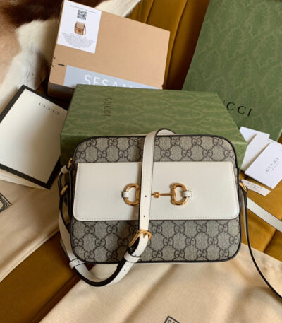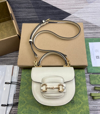Original price was: $500.00.$250.00Current price is: $250.00.HORSEBIT 1955 MINI TOP HANDLE BAG 18 IN WHITE CALFSKIN GOLD HARDWARE
