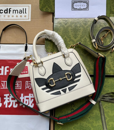 Original price was: $600.00.$285.00Current price is: $285.00.GGxADIDAS HORSEBIT 1955 TOTE BAG 20 WITH WEB STRAP IN WHITE MIX BLACK CALFSKIN GOLD HARDWARE