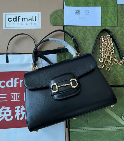 Original price was: $500.00.$250.00Current price is: $250.00.HORSEBIT 1955 MEDIUM TOP HANDLE BAG 29 IN BLACK CALFSKIN GOLD HARDWARE