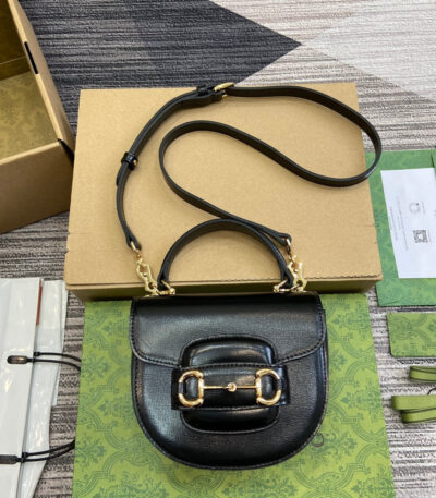 Original price was: $500.00.$250.00Current price is: $250.00.HORSEBIT 1955 MINI TOP HANDLE BAG 18 IN BLACK CALFSKIN GOLD HARDWARE