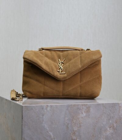 Original price was: $799.00.$285.00Current price is: $285.00.YSL 25S LOULOU PUFFER MINI 23 IN TAN BROWN SUEDE GOLD HARDWRE
